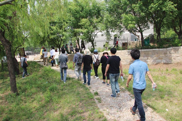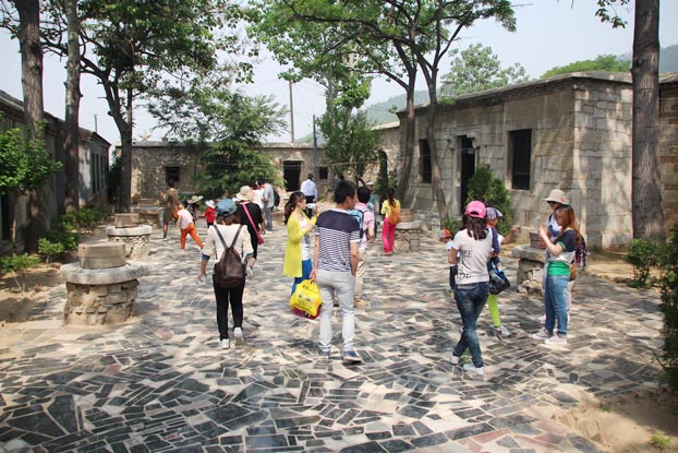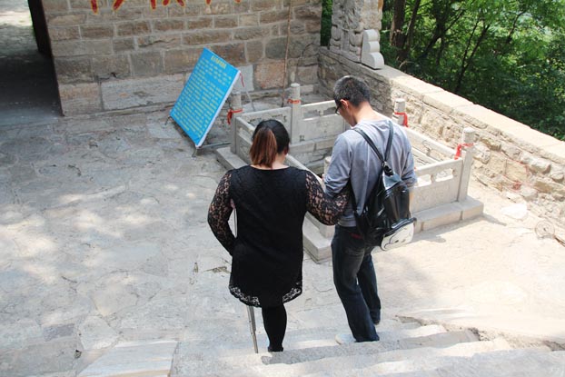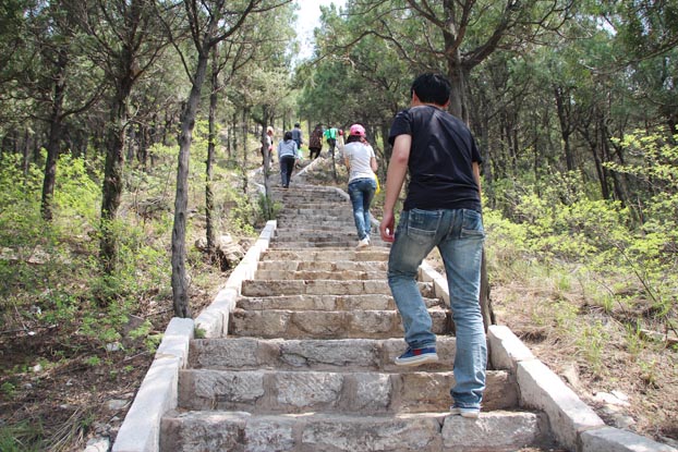 盤桓片刻,繼續(xù)旅程。將近中午,大家終于登上大峰山山巔,齊長城遺址即坐落于此。一堵古舊城墻,不知埋藏了多少陳年舊事。城墻遺址附近密林間立有一塊巨石,石上刻有“孟姜女哭長城處”。離開齊長城遺址,往西走,不久就到了屯兵營。出了屯兵營,向南行,到帝城門,大家從此處沿石階下山。