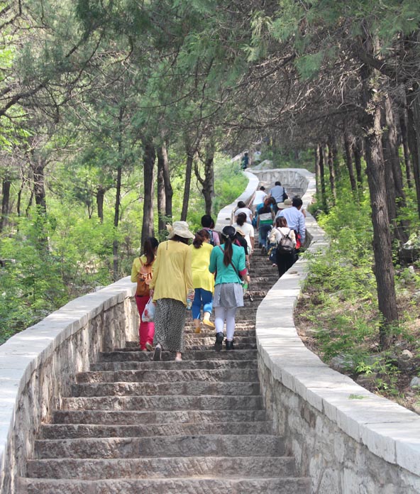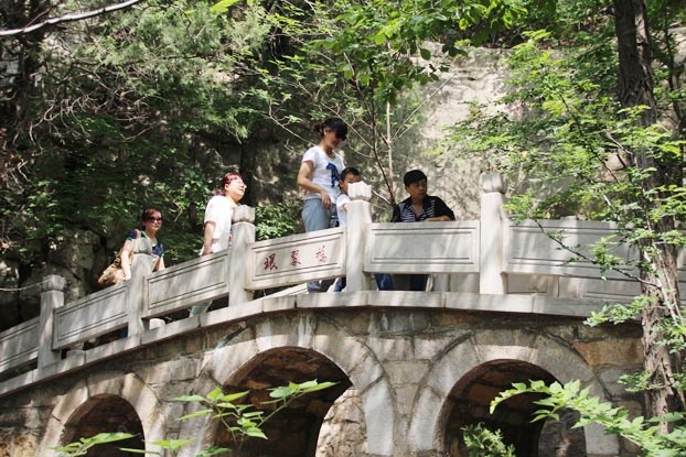 大家從公司乘車出發(fā),抵達大峰山風景區(qū)后,在景區(qū)入口處合影留念,然后進入景區(qū)。山勢陡峻,山道崎嶇,眾人拾階而上,沿途所見,景色清幽。道旁怪石突兀,石上刻字古樸,林間清風徐來,令人心情愉悅。前行許久,漸至佳境,道中石上鐫刻“峰回路轉(zhuǎn),曲徑通幽”八個大字,字跡赫然。折而向東,再沿石階攀登,前面幾棵大樹之下,有一處茶館。茶館東端,即是峰云觀。青山藏靈秀,峰云觀臥踞深山,枝葉掩映,黃瓦灰墻,別有一番韻致。