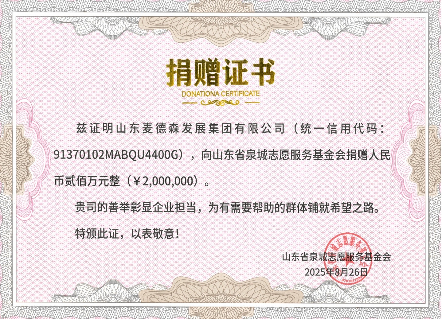 山東麥德森發(fā)展集團始終秉承“扛著黨旗創(chuàng)業(yè),戴著黨徽奉獻”的政治信念,探索總結“長鼓型”黨建工作式,實現(xiàn)企業(yè)發(fā)展與黨建工作“共商共建共享”。多年來,企業(yè)持續(xù)秉承“內求利他、濟世立功”的價值觀,在扶殘、助學、脫貧攻堅、鄉(xiāng)村振興等領域勇?lián)鐣熑危塾嬀杩罹栉?000余萬元。在承擔社會公益逐步走向制度化、規(guī)范化的同時,努力探索獨具特色的麥德森公益之路。