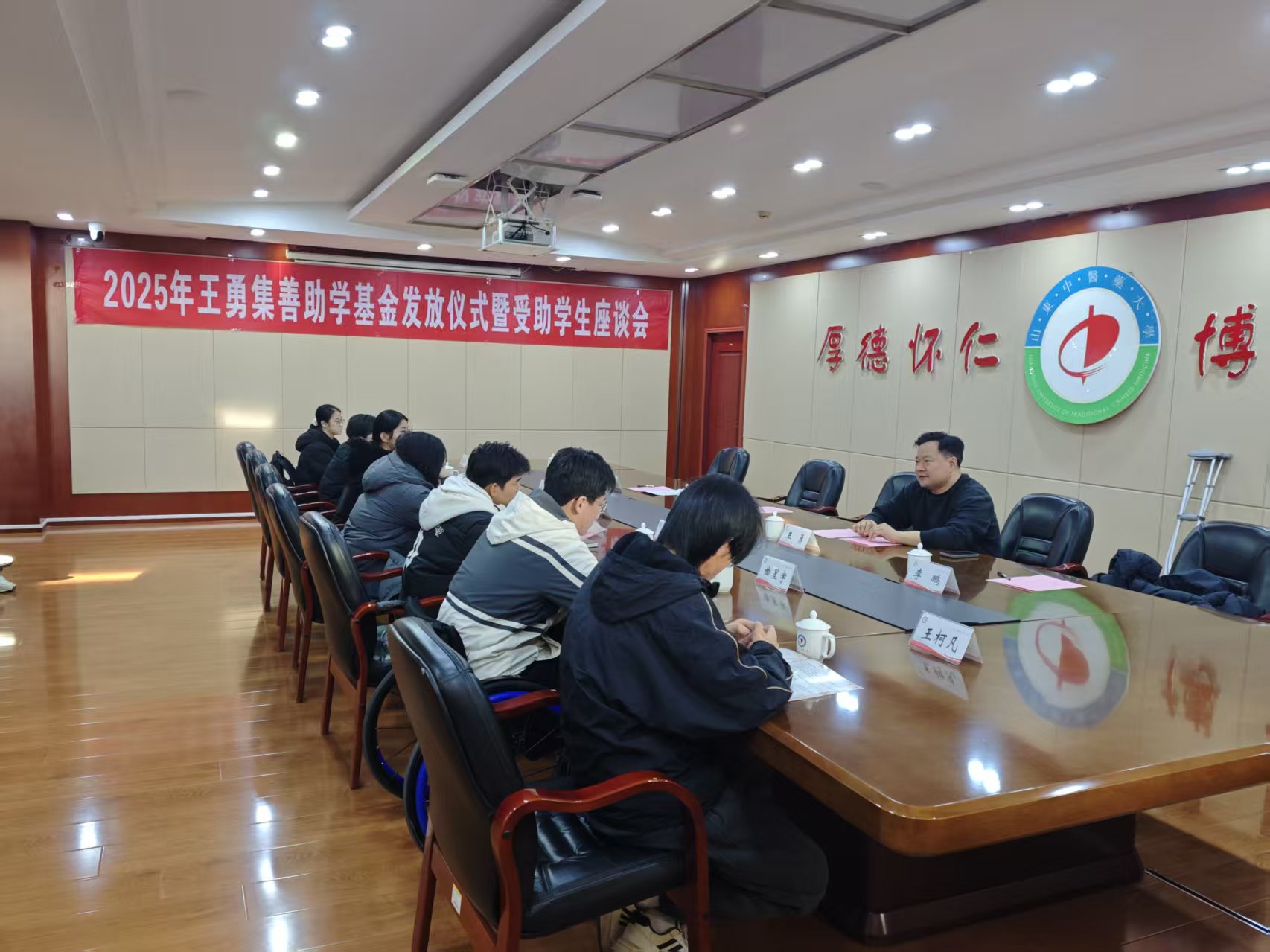 項目發起人,山東省殘疾人福利基金會理事,山東麥德森發展集團黨委書記、董事長王勇出席,并與山東中醫藥大學8位受助25屆殘疾新生代表交流座談。