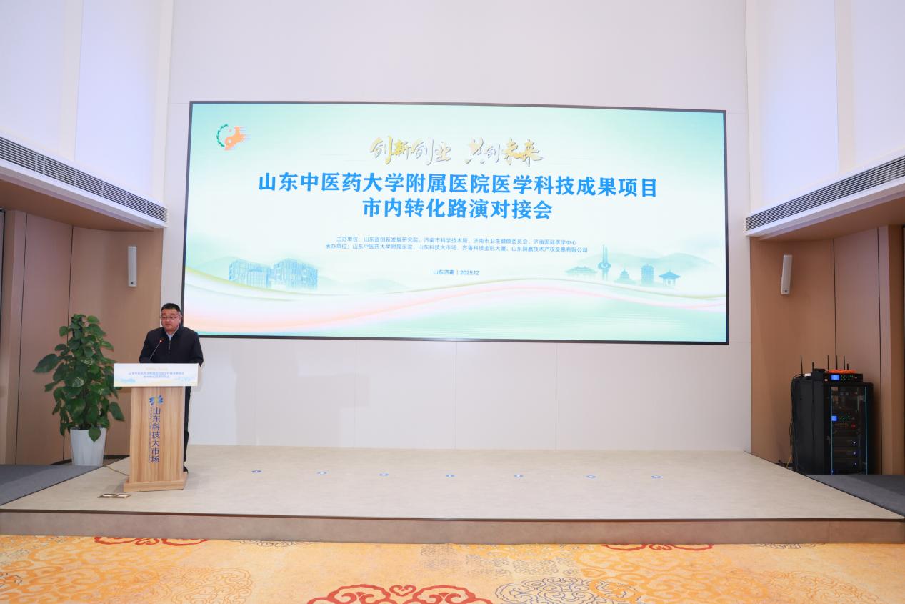 本次活動由山東省創(chuàng)新發(fā)展研究院、濟(jì)南市科學(xué)技術(shù)局、濟(jì)南市衛(wèi)生健康委員會、濟(jì)南國際醫(yī)學(xué)中心聯(lián)合主辦,旨在推動醫(yī)院創(chuàng)新成果走向市場,促進(jìn)醫(yī)產(chǎn)學(xué)研用深度融合。濟(jì)南市科技局黨組成員、副局長彭文博,山東中醫(yī)藥大學(xué)附屬醫(yī)院黨委副書記、院長鄧華亮等領(lǐng)導(dǎo)出席并致辭,省內(nèi)外生物醫(yī)藥企業(yè)、投資機(jī)構(gòu)、媒體代表等100余人參會。