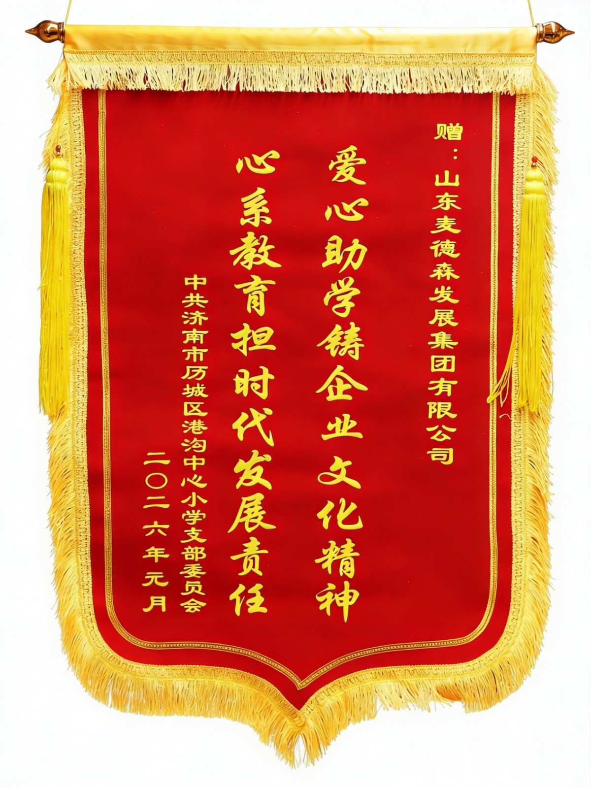 活動現場,港溝中心小學校委會與家長委員會共同向山東麥德森發展集團贈送錦旗,旗面“心系教育擔時代發展責任,愛心助學鑄企業文化精神”的話語,正是對麥德森集團長期以來支持教育、踐行社會責任的真實寫照。