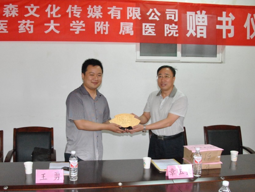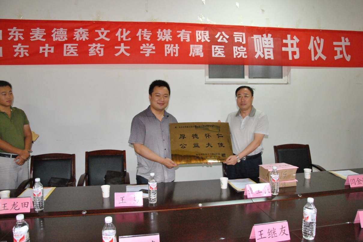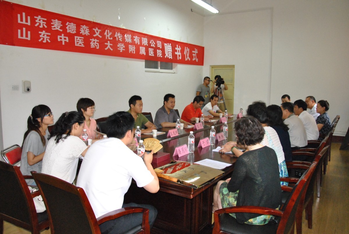 2012年8月3日上午9時,適逢盛夏喜雨。我公司董事長王勇攜公司高層向母校山東中醫(yī)藥大學(xué)附屬醫(yī)院(山東省中醫(yī)院)捐贈700余冊價值共計8萬余元的圖書活動儀式在附院圖書館會議室舉行,山東中醫(yī)藥大學(xué)第一附屬醫(yī)院李偉院長主持,附院薛一濤副院長、黨辦、院辦、宣傳部、醫(yī)務(wù)部、教學(xué)管理處等領(lǐng)導(dǎo)參加了本次活動。出席本次活動還的還有山東電視臺、濟南時報等媒體。