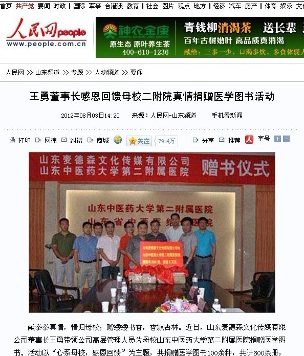 人民網人物頻道對山東麥德森文化傳媒有限公司公益活動進行報道,相關鏈接地址:http://sd.people.com.cn/n/2012/0803/c231072-17318331.html。