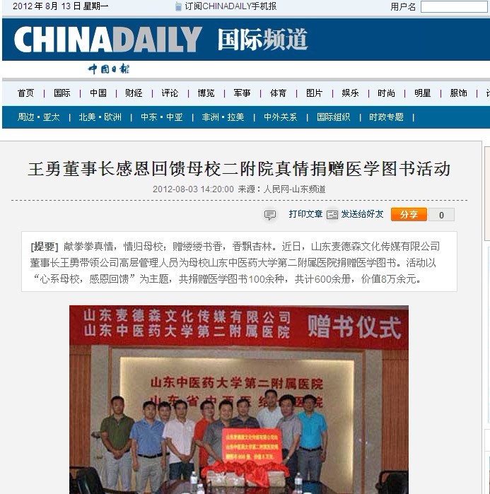 中國日報網對山東麥德森文化傳媒有限公司公益活動進行報道,相關鏈接地址:http://www.chinadaily.com.cn/hqgj/jryw/2012-08-03/content_6629444.html#