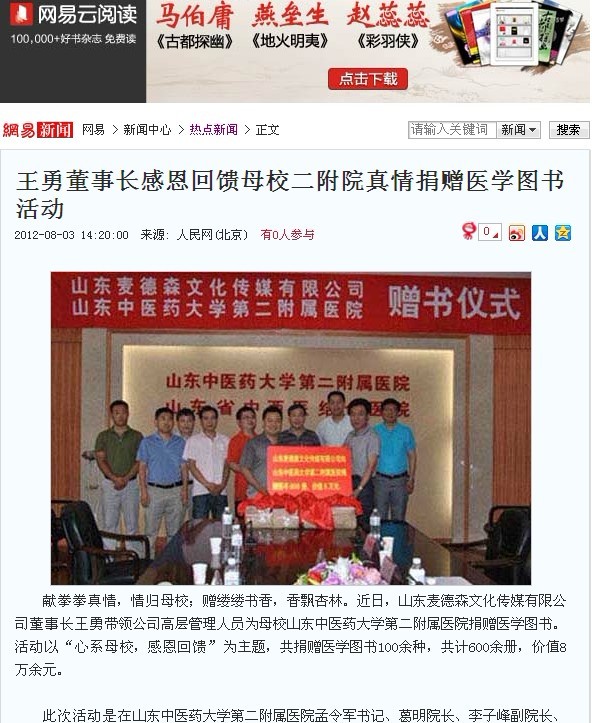 網易新聞頻道對山東麥德森文化傳媒有限公司公益活動進行報道,相關鏈接地址:http://news.163.com/12/0803/14/8807605C00014JB6.html。