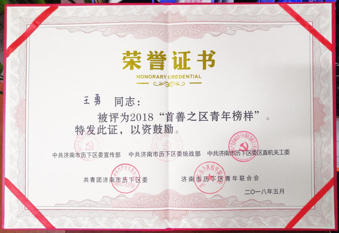 為更好地學習貫徹黨的十九大精神和習近平新時代中國特色社會主義理論,深入推進“勇做奪標突擊手,爭當濟南第一團”活動, 5月4日上午,紀念“五四”主題活動暨“2018首善之區青年榜樣”頒獎典禮在歷下大廈隆重舉行。歷下區委副書記尹紅梅,區委常委、組織部部長續明,區委常委、統戰部部長杜寶現,副區長丁曉紅,區政協副主席房玉萍等領導出席本次活動。我集團董事長王勇在本次活動中榮獲2018“首善之區青年榜樣”榮譽稱號。