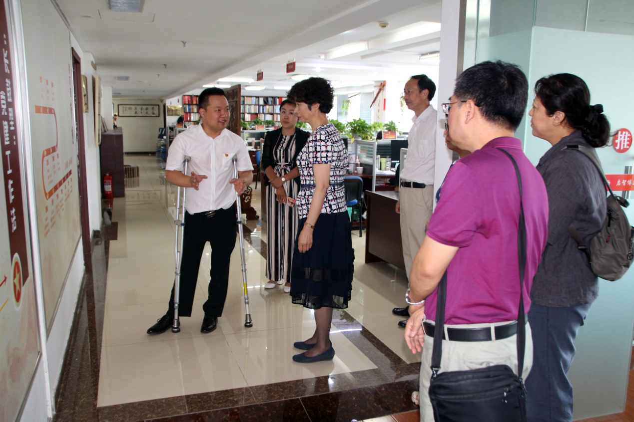 在王勇博士的陪同下,劉主席一行依次參觀了集團黨建活動室、企業文化墻、殘疾人文化藝術長廊以及各業務職能部門辦公區域。參觀過程中,王勇博士向領導們詳細介紹了集團企業文化、黨員突擊隊建設以及“長鼓型”黨建工作法,并就企業目前經營現狀和未來發展方向向領導們作出匯報。